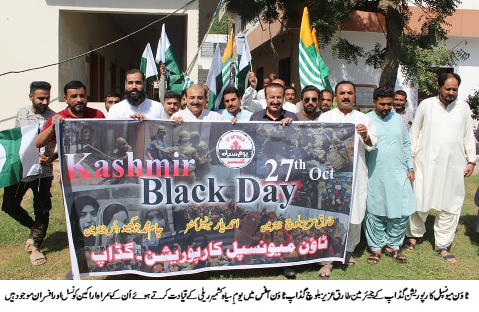 ٹاؤن میونسپل کارپوریشن گڈاپ کے چیئرمین طارق عزیز بلوچ گڈاپ ٹاؤن آفس میں یوم سیاہ کشمیر ریلی کے قیادت کرتے ہوئے ان کے ہمراہ اراکین کونسل اور افسران موجودہیں