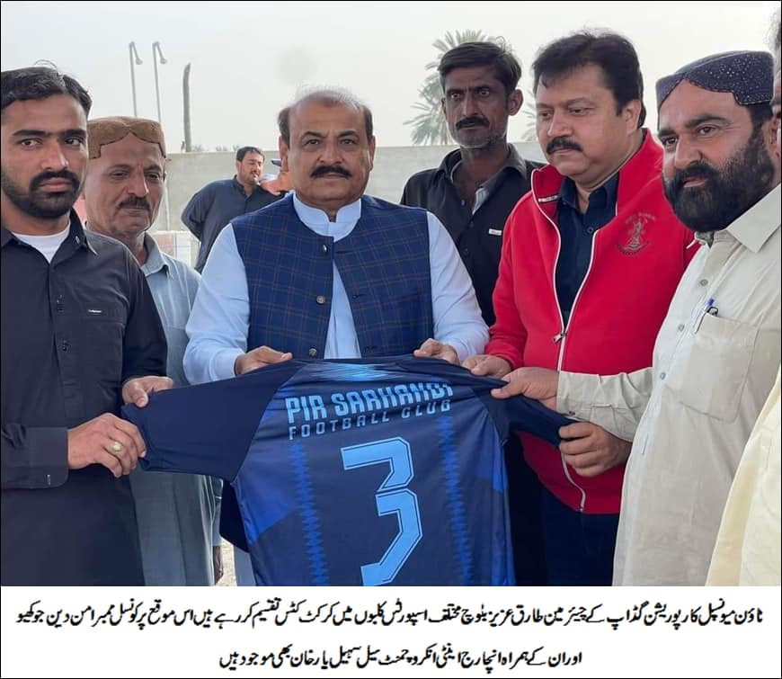 ٹاؤن میونسپل کارپوریشن گڈاپ کے چیئرمین طارق عزیز بلوچ مختلف اسپورٹس کلبوں میں کرکٹ کٹس تقسیم کررہے ہیں اس موقع پر کونسل ممبر امن دین جوکھیو اور ان کے ہمراہ انچارج اینٹی انکروچمنٹ سیل سہیل یار خان بھی موجود ہیں