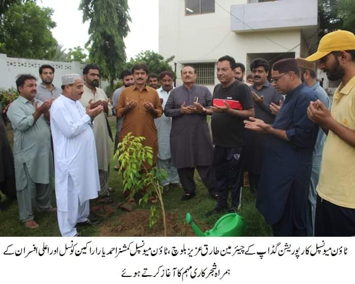 ٹاؤن میونسپل کارپوریشن گڈاپ کے چیئرمین طارق عزیز بلوچ،ٹاؤن میونسپل کمشنر احمد یار اراکین کونسل اور اعلی افسران کے ہمراہ شجر کاری مہم کا آغاز کرتے ہوئے