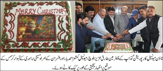 ٹاؤن میونسپل کارپوریشن گڈاپ کے چیئرمین طارق عزیز بلوچ،میونسپل کمشنر احمد یار اور افسران کے ہمراہ مسیحی برادری کے تہوار کرسمس کے موقع پر اظہار یکجہتی کے طور پر کیک کاٹے ہوئے