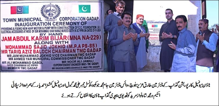 ٹاؤن میونسپل کارپوریشن گڈاپ کے چیئرمین طارق عزیز بلوچ،وائس چیئرمین جام محمد جوکھیو،کونسل ممبر علی محمد گبول،عبدالستار جوکھیواور میونسپل کمشنر احمد یار کے ہمراہ واٹر سپلائی اسکیم درمحمد شاہ نواز مرید گوٹھ یوسی پیپری گڈاپ ٹاؤن کا افتتاح کرتے ہوئے