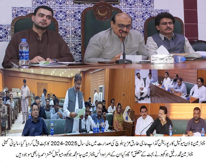 چیئرمین ٹاؤن میونسپل کارپوریشن گڈاپ طارق عزیز بلوچ کی صدارت میں مالی سال 2024-2025 کا بجٹ پیش کردیاگیا،مالیاتی کمیٹی چیئرمین محمد رفیق جوکھیو نے بجٹ کے متعلق آگاہ کیا ان کے ہمراہ وائس چیئرمین جام محمد جوکھیو،میونسپل کمشنر احمد یار بھی موجود ہیں