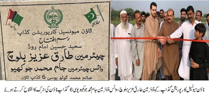 ثاؤن میونسپل کارپوریشن گڈاپ کے چیئرمین طارق عزیز بلوچ،وائس چیئرمین جام محمد جوکھیو یوسی 6 گڈاپ ٹاؤن کی سٹرک کا افتتاح کرتے ہوئے
